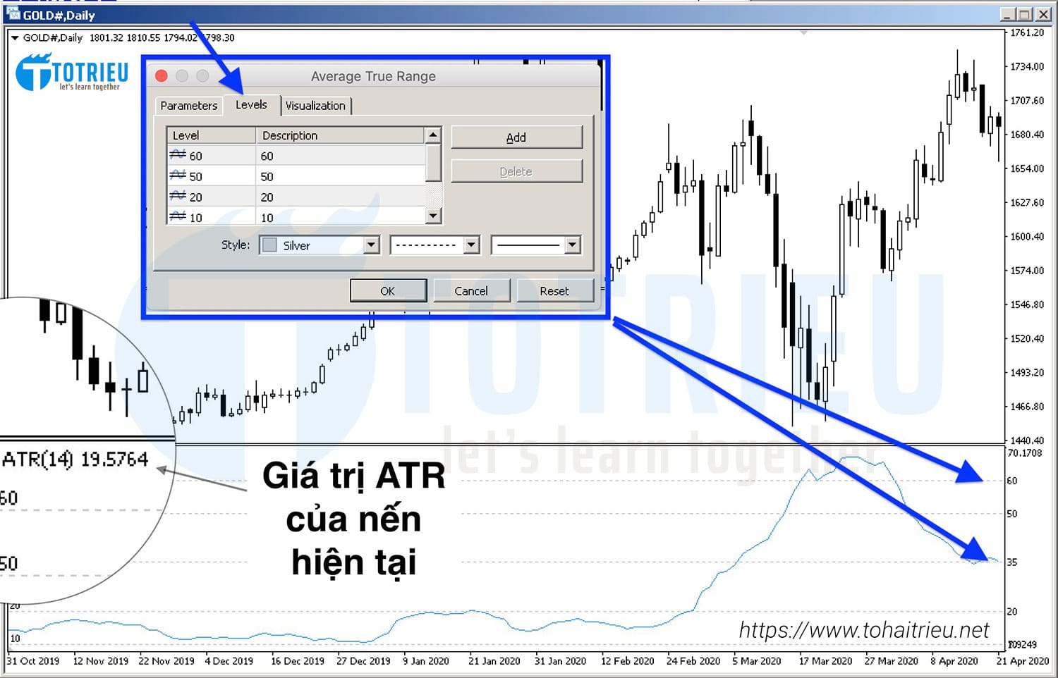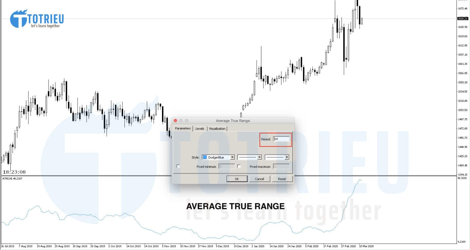 - Timeframe Daily + ATR(14) = Khoảng biến động trung bình thực tế một ngày với chu kỳ 14 ngày
