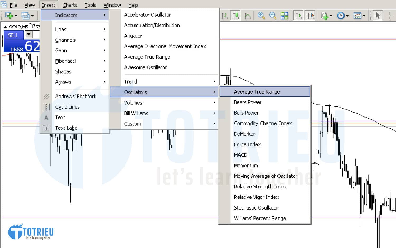 Để thêm Chỉ báo ATR - Average True Range vào MT4 bạn chỉ cần vào Insert -> Indicator -> Oscillators -> Average True Range.