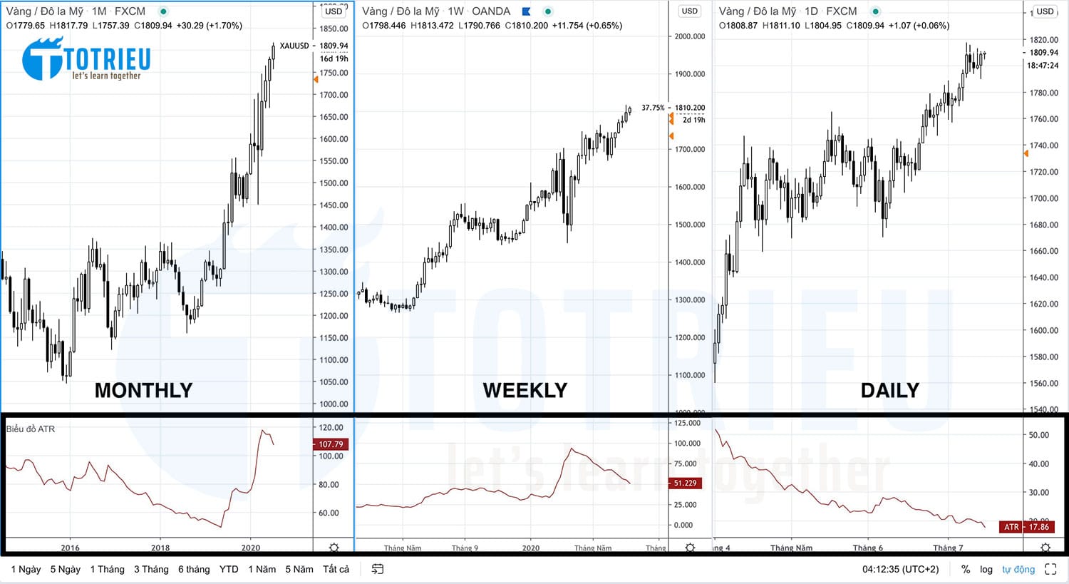 Hình ảnh dưới đây là ví dụ về ATR cho 3 Timeframe Monthly, Weekly, Daily trên biểu đồ Giá Vàng: