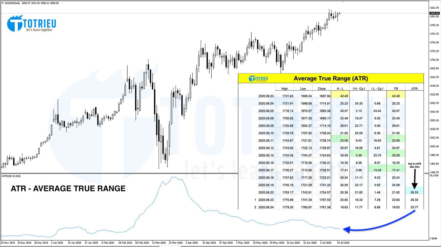 Giá trị ATR14 đầu tiên được tính là Trung bình cộng của 13 giá trị TR được tính trước đó.