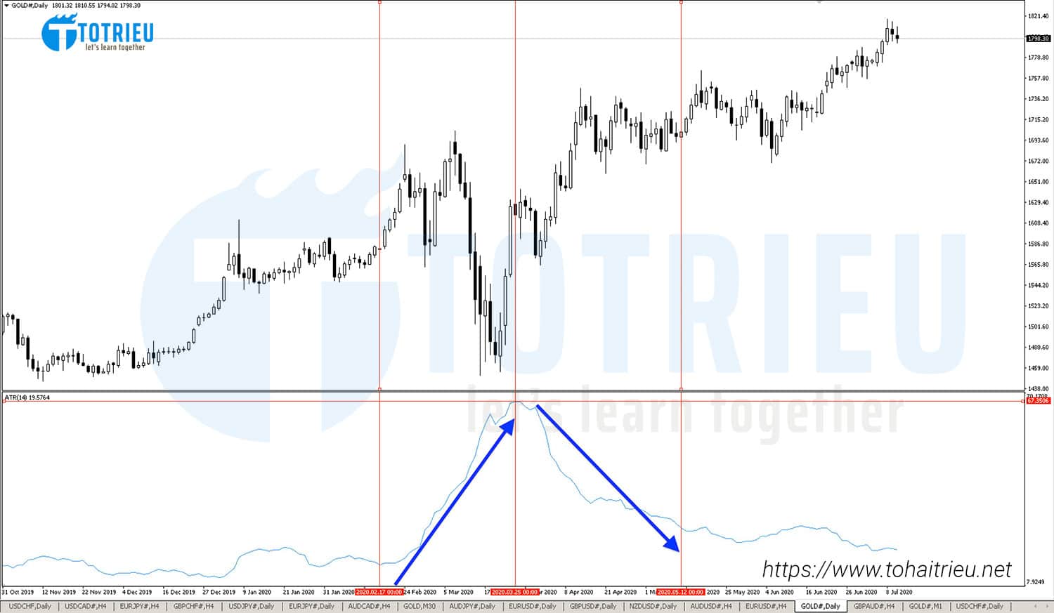Trong các phân đoạn thị trường áp dụng ATR, chúng ta sẽ thấy ATR tăng dần. Trong phân đoạn không dùng ATR thì thời điểm này ATR sẽ bắt đầu giảm dần: