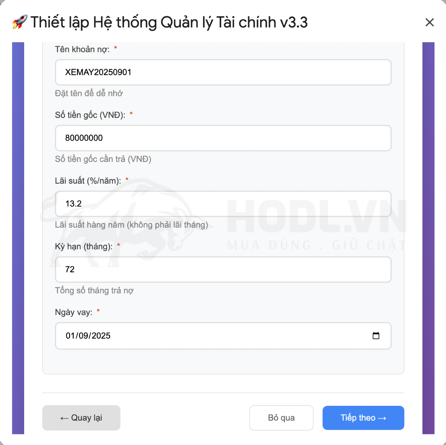 - Tên khoản nợ: XEMAY20250901 (đặt tên dễ nhớ)