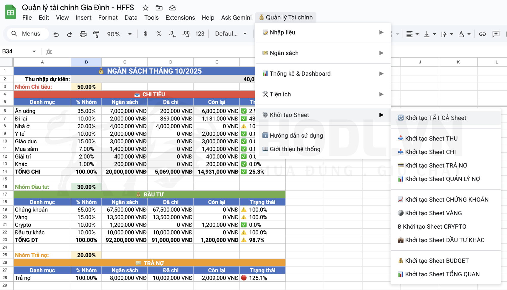 - Tạo các sheet cần thiết (THU, CHI, NỢ, ĐẦU TƯ, DASHBOARD…)