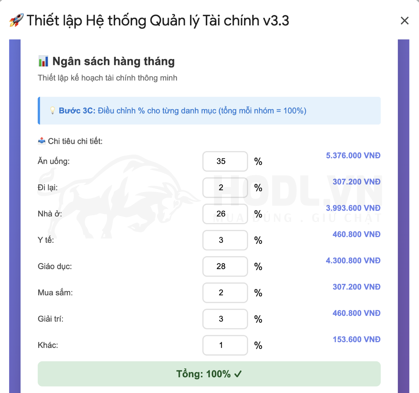 Cộng tổng 100% chi tiêu được tính dựa theo tổng số tiền chi tiêu thiết lập ở bước trước đó. Ví dụ: Thu nhập 24 triệu và chi tiêu 50% thì khi cộng tổng 100% trong thiết lập chi tiêu sẽ = 24 x 0,5 – 12 triệu.