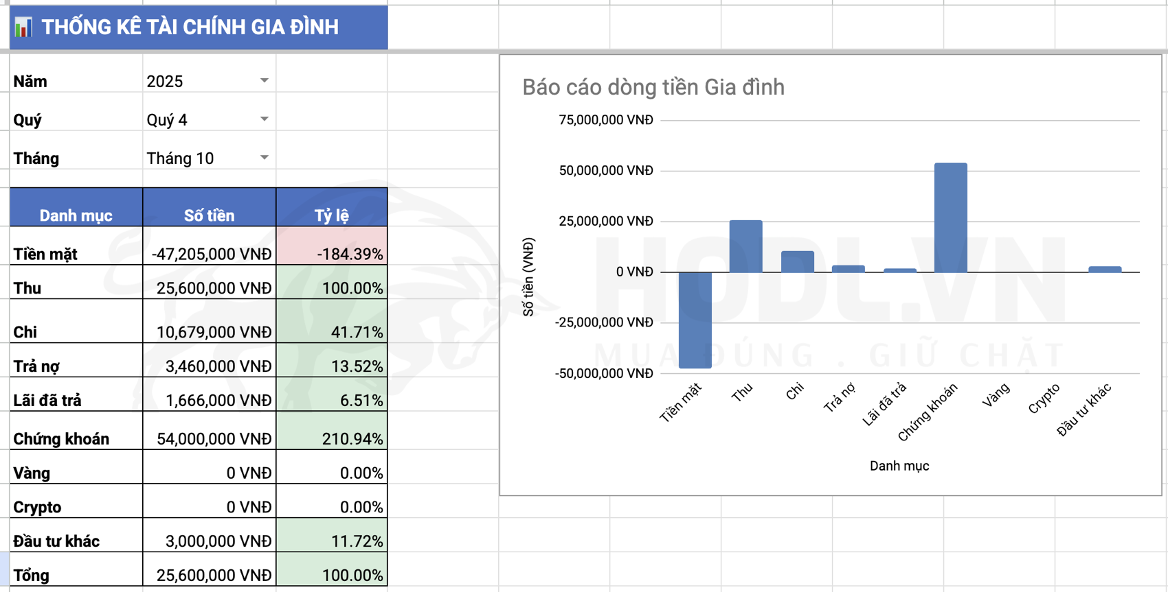 Sau khi nhập xong tất cả giao dịch trong ngày, chị Dậu làm một việc cuối cùng trước khi tắt máy: mở Sheet “📊 THỐNG KÊ TÀI CHÍNH GIA ĐÌNH” lên và nhìn vào Dashboard. Không cần làm gì cả, mọi thứ đã tự động cập nhật.