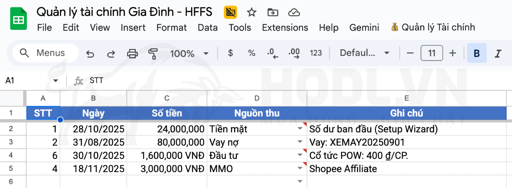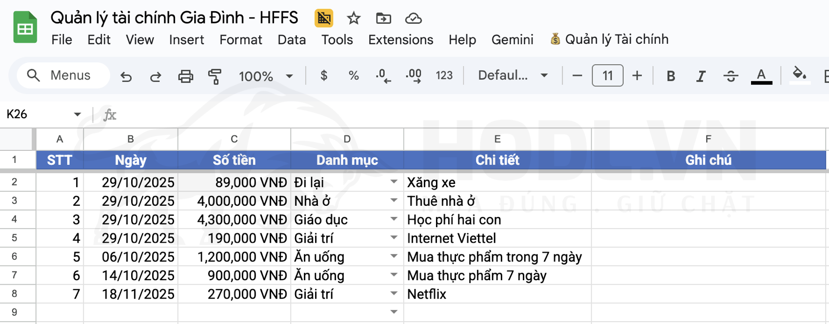 Thứ hai, mở Google Sheet HFFS lên, ghi lại tất cả thu nhập và chi tiêu của 7 ngày qua bằng cách chép từ lịch sử ngân hàng. Có thể một số khoản tiền mặt bạn không còn nhớ, không sao. Ghi những gì có trong lịch sử ngân hàng là đủ. Mục tiêu không phải là “hoàn hảo”, mà là “bắt đầu”.