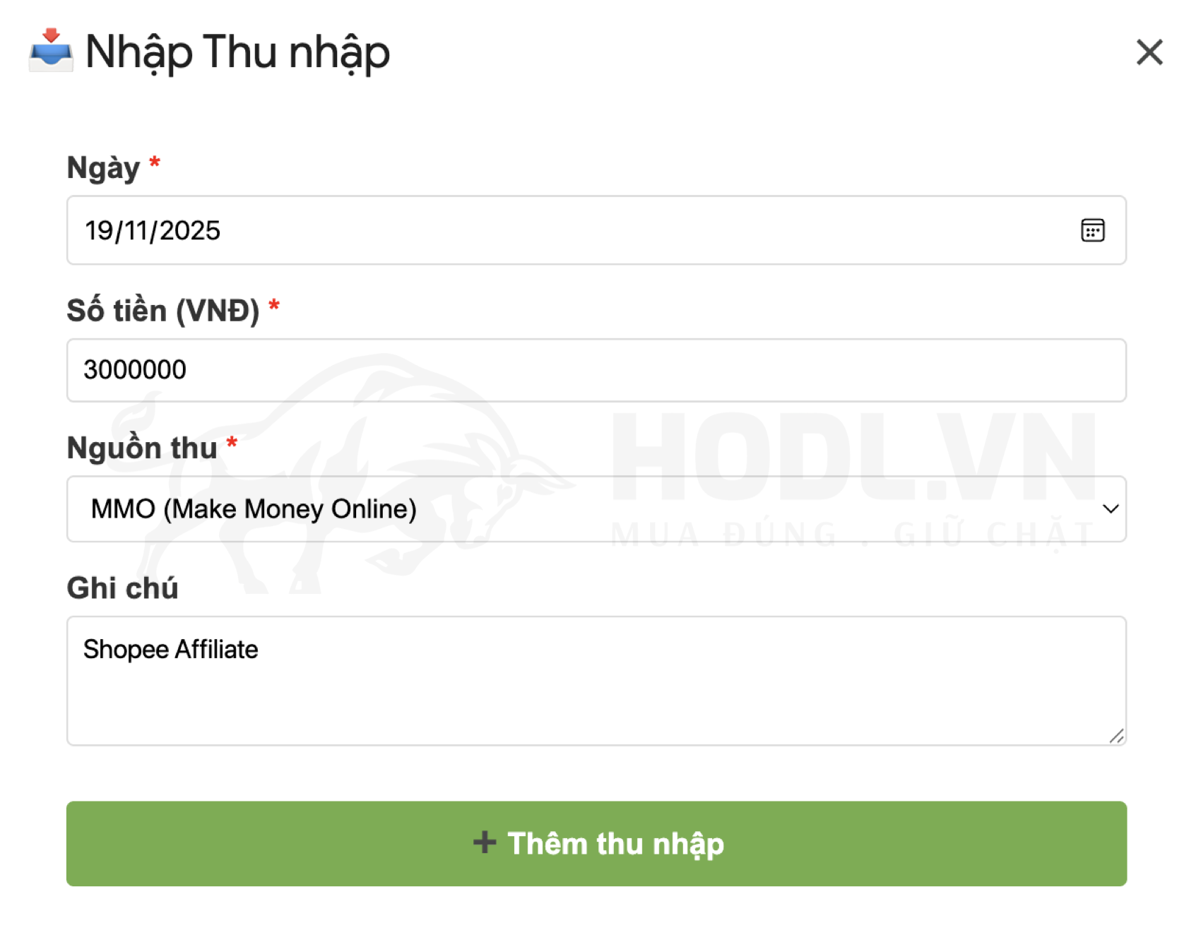 Chị mở HFFS, nhập tương tự: Ngày 18/11, số tiền 3000000, nguồn thu “MMO (Make Money Online)”, ghi chú “Shopee Affiliate tháng 11”. Thêm.