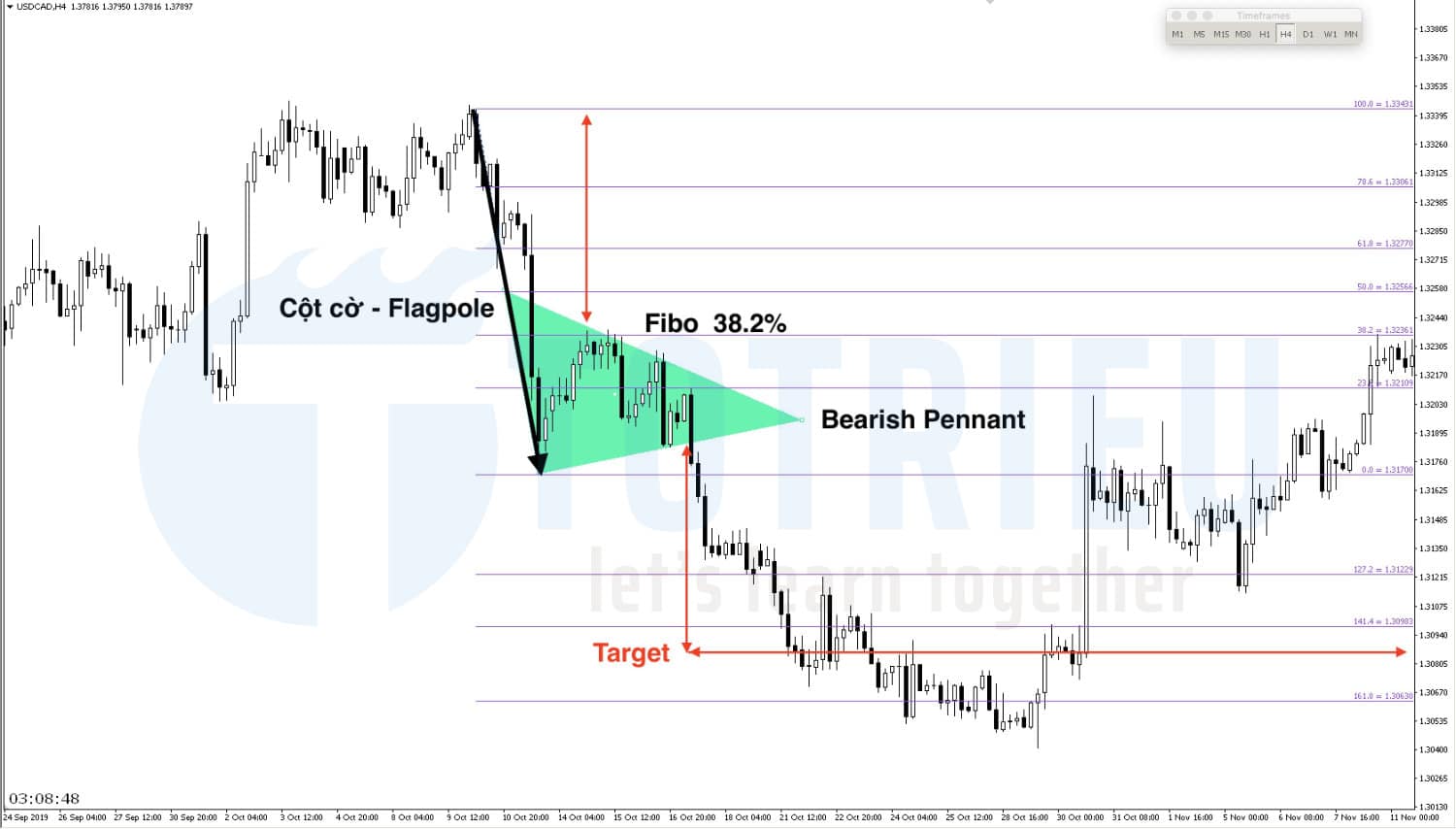 - Các mức phục hồi để tạo cờ thường sẽ chỉ phục hồi về mức Fibo Retracement 38.2% của Cột cờ (Flagpole) nếu sâu hơn thì khả năng cao đó là mô hình tam giác chứ không phải cờ đuôi nheo.