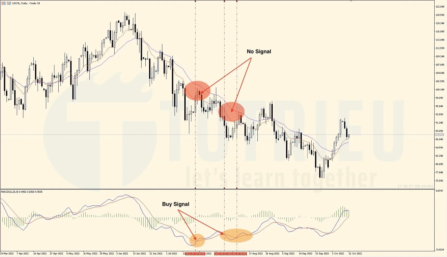 Tôi vẫn sử dụng MACD(12,26,9) kết hợp với EMA12, EMA26. Bạn có thể quan sát thấy ở thời điểm MACD cho Signal Buy, thì 2 đường EMA gần như không cho bất kỳ tín hiệu nào. Sau đó thì chúng ta có thể nhận thấy rằng hoá ra đó chỉ là tín hiệu giả mạo.