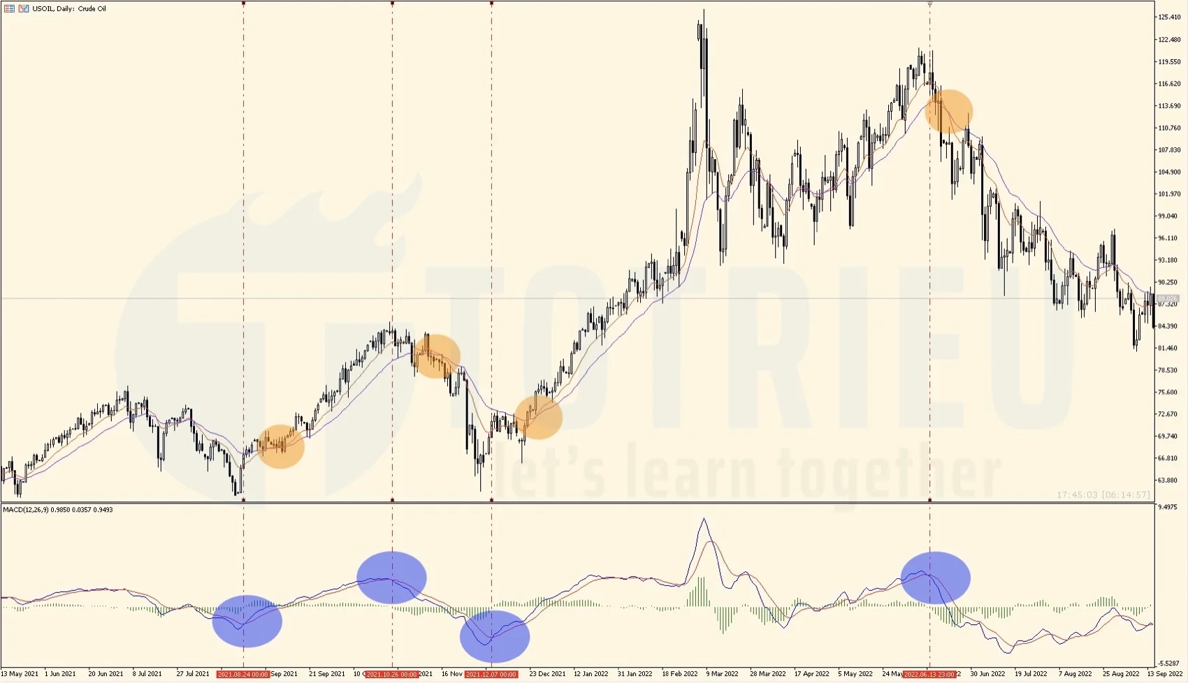 Hãy chú ý vào các thời điểm mà Tôi đánh giấu sự giao cắt giữa MACD Signal và MACD Line, ngay sau đó thì 2 đường EMA12 và EMA26 cũng cho tín hiệu giao cắt. Đây là các tín hiệu đáng tin cậy mà bạn có thể xem xét tham gia thị trường theo hướng giao cắt của MACD Line với MACD Signal và hướng giao cắt của các đường EMA.