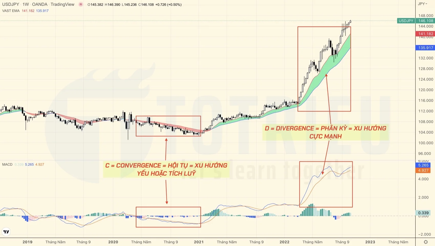 Trong minh hoạ phía trên, bạn có thể nhận thấy rõ ở thời điểm USDJPY biến động yếu, khoảng cách giữa 2 đường EMA12 và EMA26 hoặc khoảng cách giữa MACD Line và MACD Signal là rất hẹp, gần như tiếp cận nhau = Hội tụ