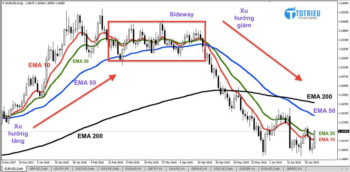 Trong xu hướng thị trường đang Sideway, 03 đường EMA 10, EMA 20, EMA 50 sắp xếp khá lộn xộn, liên tục cắt nhau và gần như bó, bện chặt vào với nhau.