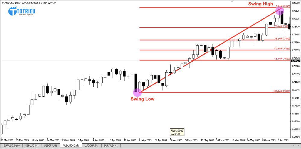 Ở đây, Tô vẽ Fibonacci để lựa chọn các mức Fibonacci phù hợp bằng cách nhấp vào Swing Low tại 0.6955 vào ngày 20/04/2009 và kéo trỏ chuột tới Swing High tại 0.8264 vào ngày 03/06/2009.
