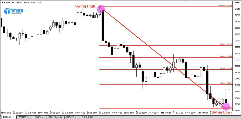 Trong biểu đồ phía trên, Mức Swing High Tô chọn là 1.2700 vào ngày 07/11/2014. Mức Swing Low là 1.2358 vào ngày 07/11/2014.