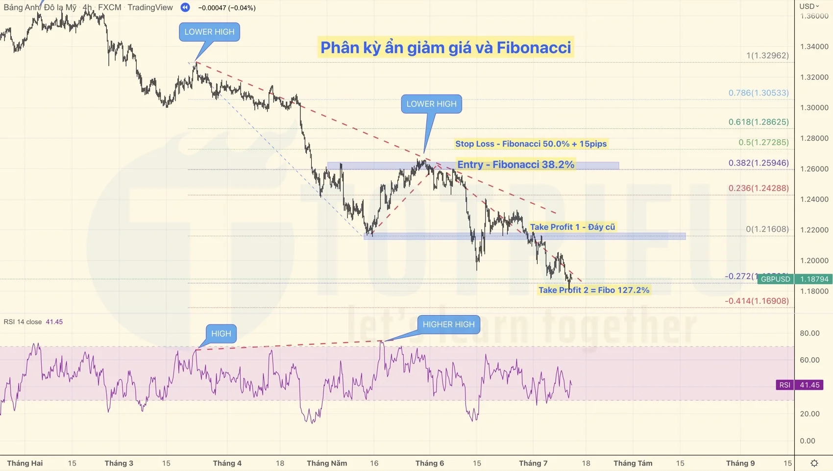 Biểu đồ GBPUSD liên tục cho thấy dấu hiệu Đỉnh sau thấp hơn đỉnh trước - Lower High trên biểu đồ giá nhưng đột nhiên xuất hiện dấu hiệu Higher High- Đỉnh sau cao hơn đỉnh trước trên biểu đồ RSI, đó chính là PHÂN KỲ ẨN GIẢM GIÁ.