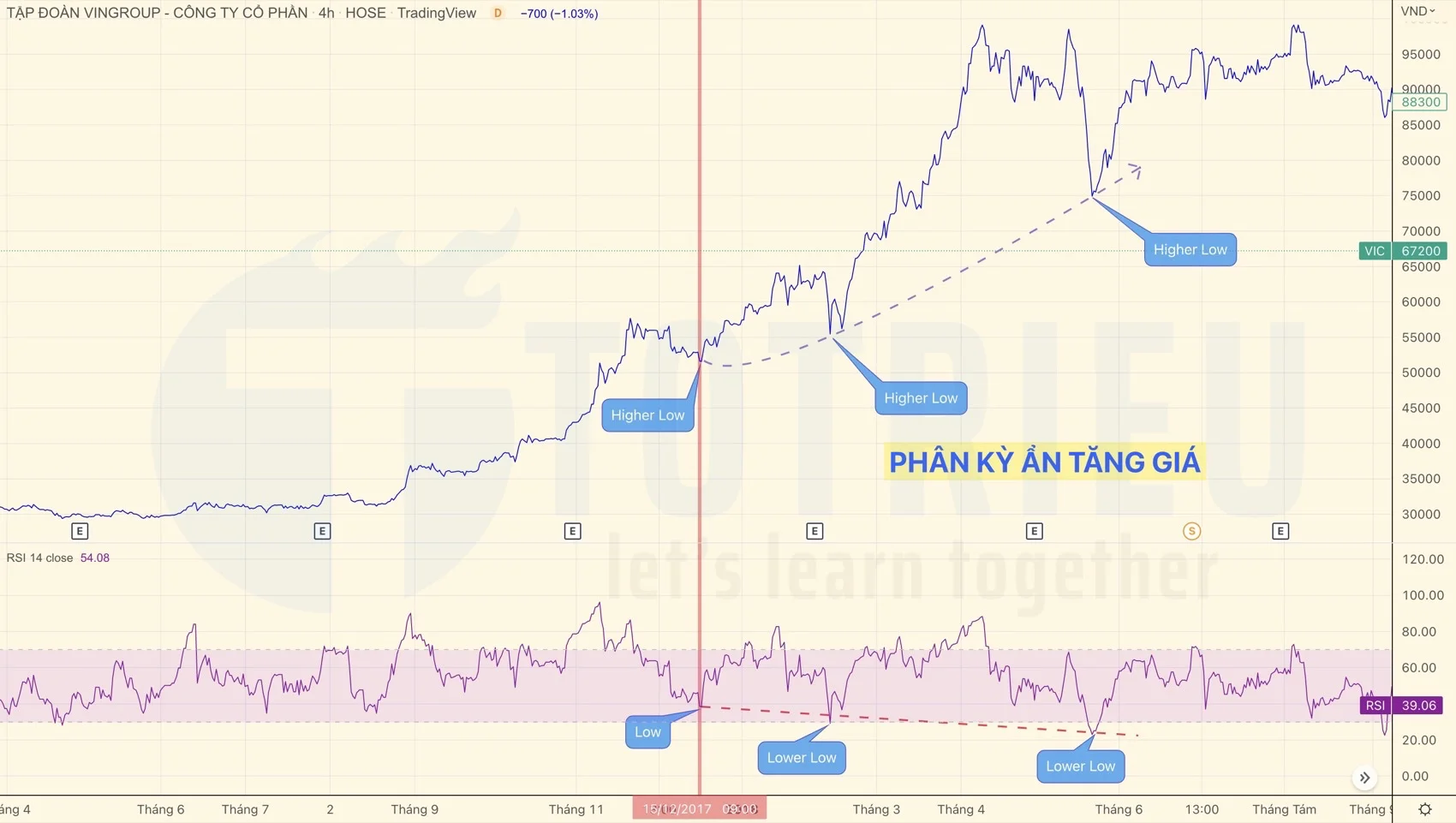 Và trên biểu đồ Chỉ báo RSI thì tín hiệu thì hoàn toàn ngược lại. Đáy sau liên tục thấp hơn đáy trước. Kết quả thì Cổ phiếu VIC liên tục tăng giá mạnh.