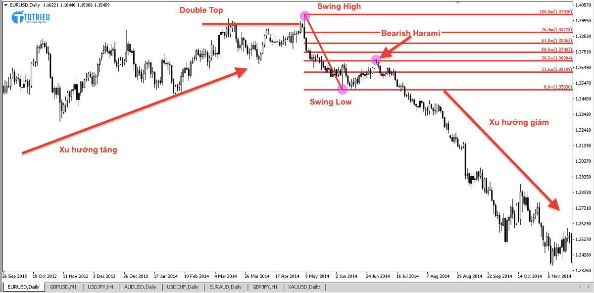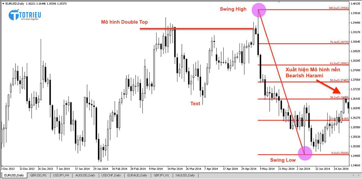 Ngay say đó, xuất hiện Mô hình nến Bearish Harami ngay ở mức kháng cự 38.2%, là mô hình nến đảo chiều từ tăng sang giảm. Mô hình này báo hiệu lực mua đã cạn kiệt và tất cả các nhà giao dịch đang tiến hành chốt lời để kết thúc việc mua trong ngắn hạn và chuẩn bị cho vị thế mới: Sell trong dài hạn.