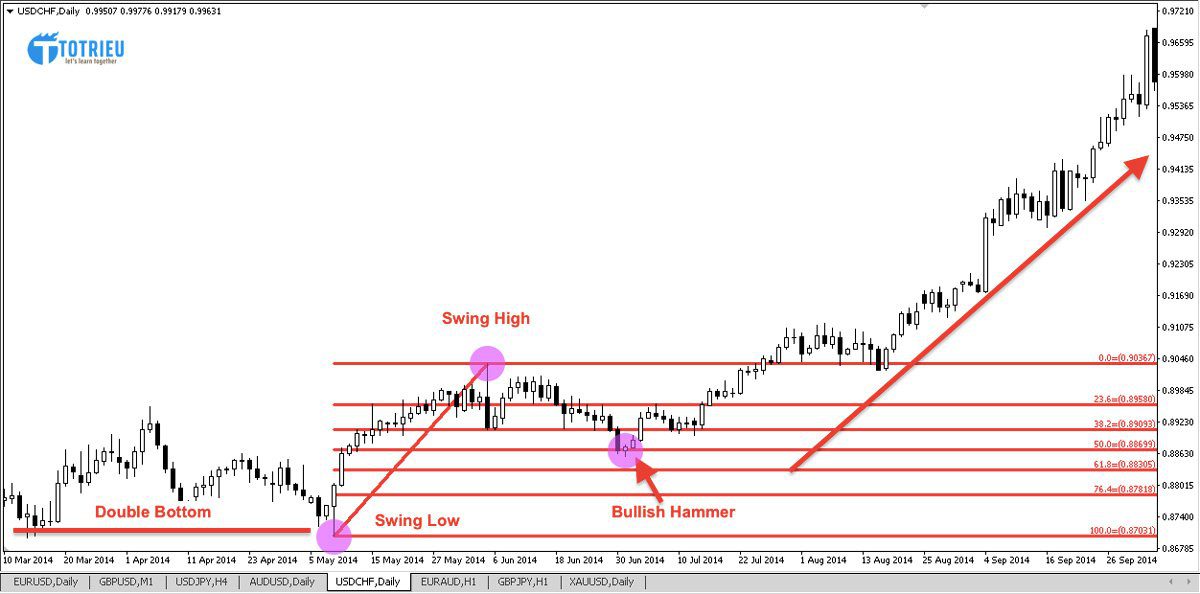Ngay khi đạt mức Swing Low, tỷ giá bật lại tạo thành một cây Bullish Hammer quá khổ và giá lại tiếp tục đi xuống nhưng không chạm được Swing Low. Giá quay ngược trở lên, phá vỡ vùng 23.6% giờ đây là vùng Kháng cự rồi tiếp tục tiến đến mức 38.2%