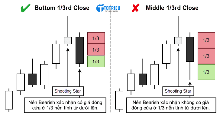 Lưu ý: Đối với mẫu Shooting Star tự xác nhận phía trên thì yêu cầu này vẫn đạt vì bản thân nó đã tự có giá đóng cửa nằm ở 1/3 thân nến tính từ dưới lên.