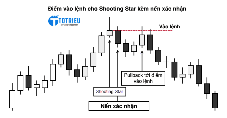Thông thường, khi xuất hiện Shooting Star, thì Shooting Star kèm nến xác nhận sau đó có thể tạo ra một vùng kháng cự mới và ngay sau khi nến xác nhận kết thúc, sẽ có một vài nến Pullback để kiểm tra lại đường kháng cự đó.