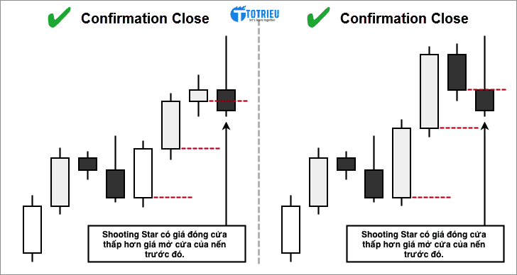 Nếu Shooting Star là nến Bearishthì giá đóng cửa của nến xác nhận Bearish phải thấp hơn giá mở cửa của Shooting Star trước đó.