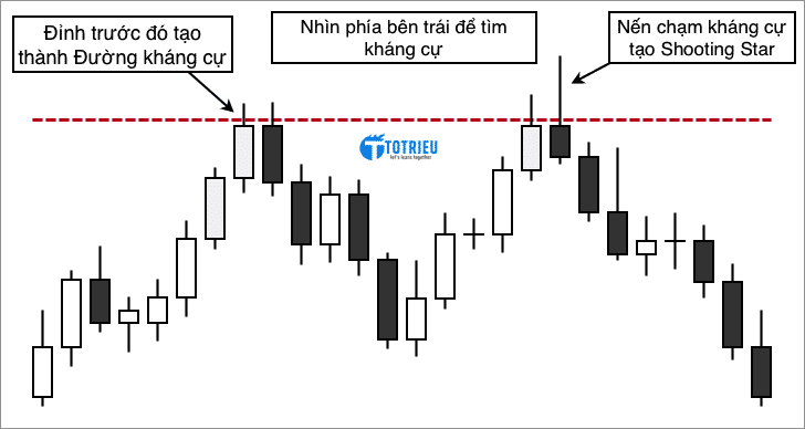 Khi kết hợp giữa Shooting Star và các đường kháng cự. Chúng ta sẽ thường thấy các mẫu Shooting Star được tạo ra là do chạm đường kháng cự và bật trở lại để hình thành nến mẫu này.