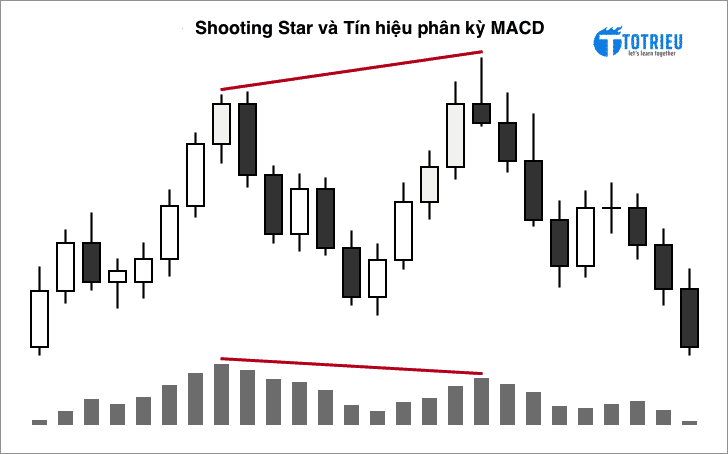 Ngay khi xuất hiện mô hình nến Shooting Star, tín hiệu phân kỳ từ MACD sẽ giúp bạn có thêm một tín hiệu tốt và chắc chắn hơn để tìm điểm và xác định xu hướng sắp tới giá sẽ đảo chiều và giảm mạnh.