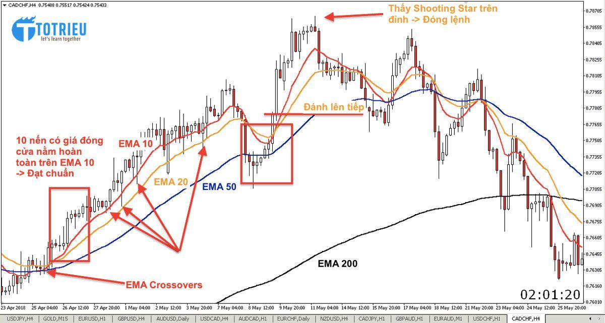- Nguyên tắc thứ tự: EMA 200 -> EMA 50 -> EMA 20 -> EMA 10