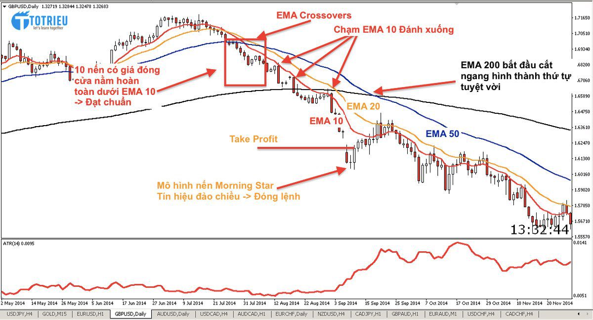 - Xu hướng giảm: EMA 200 -> EMA 50 -> EMA 20 -> EMA 10