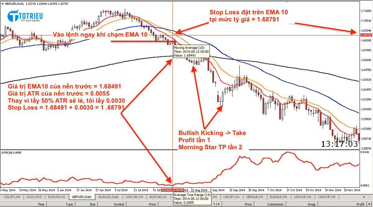 Điểm Stop Loss: lấy 50% giá trị ATR của nến trước cùng khung thời gian và nằm dưới EMA 10 (Giá trị EMA 10 của nến trước - 50% số pips ATR của nến trước đó)