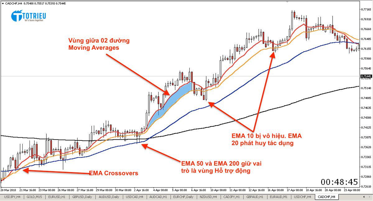 Như Tôi đã đề cập phía trên, Mỗi lớp EMA đều có thể là các Vùng Hỗ trợ hoặc kháng cự động.