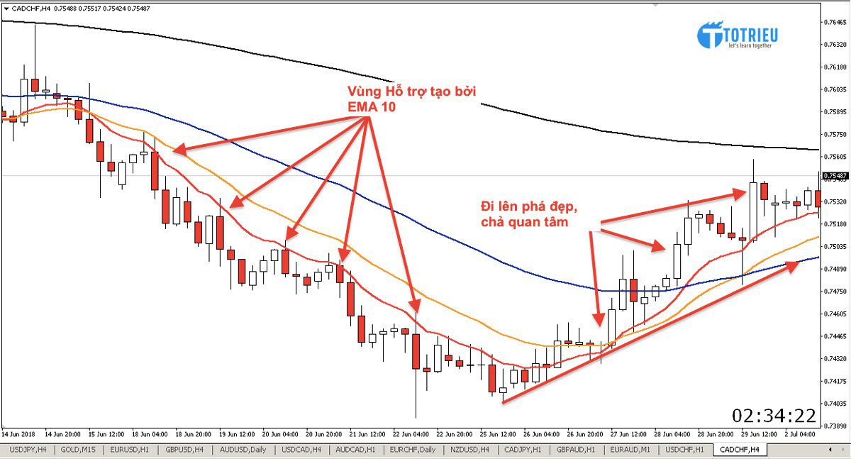 Các bạn có thể thấy, Mỗi lần chạm EMA 10, tỷ giá lại bật ngược lên và tiếp tục xu hướng của nó. Chứng tỏ EMA 10 đang đóng vai trò là Hỗ trợ cực mạnh. Nhưng chúng ta cũng phải chú ý rằng Vùng hỗ trợ này liên tục thay đổi mà không ở bất cứ mức cố định nào.