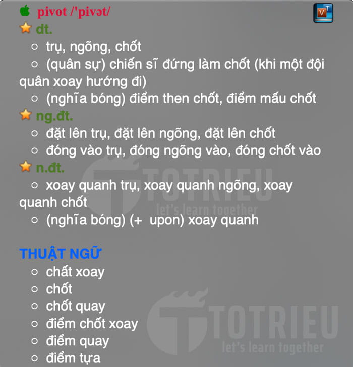 Như vậy, với những tính chất này, Theo quan điểm cá nhân của Tô khi dịch Pivot Points là "Điểm xoay"có phần chủ quan và làm thiếu đi tính chất cơ bản của Pivot Points. Dưới đây là Từ điển Anh - Việt định nghĩa về từ khóa Pivot: