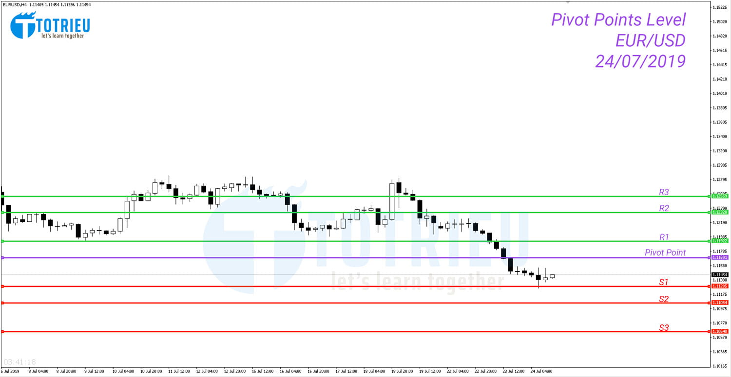 Và dưới đây là Ví dụ về tính Pivot Points cho cặp EUR/USD giá trị ngày 23/07/2019 áp dụng cho ngày 24/07/2019: