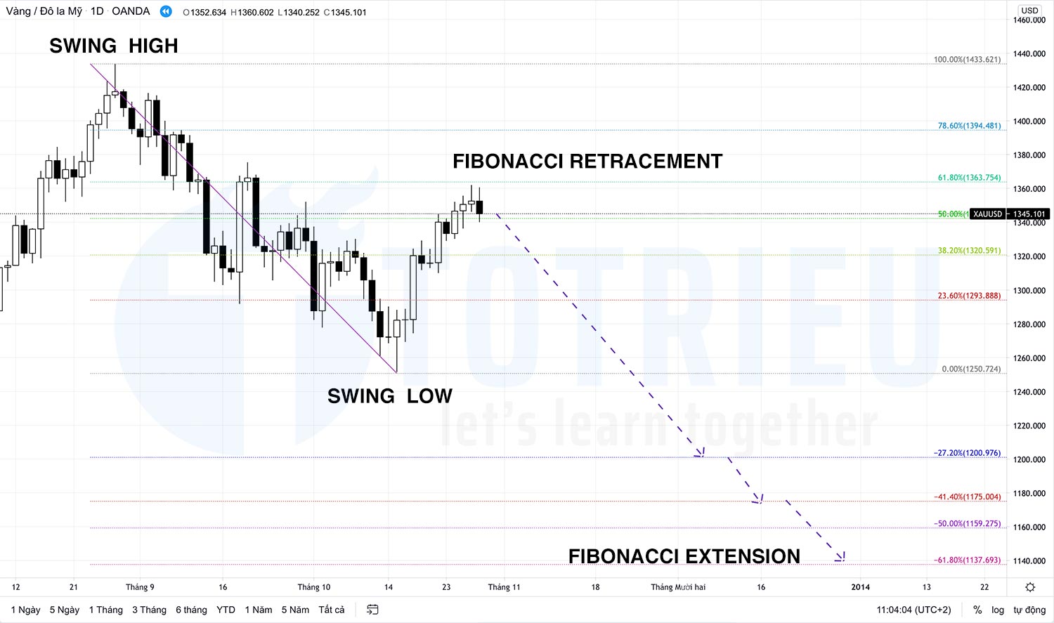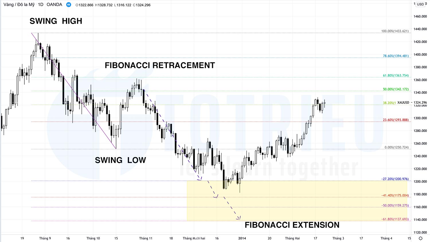 Như vậy, khi bạn tìm kiếm được Swing High và Swing Low, bạn chỉ cần đảo ngược cách vẽ Fibonacci retracement bạn sẽ có được Fibonacci Extension.