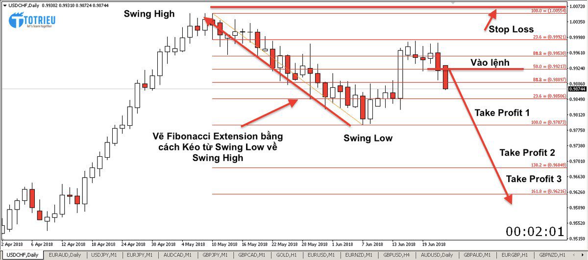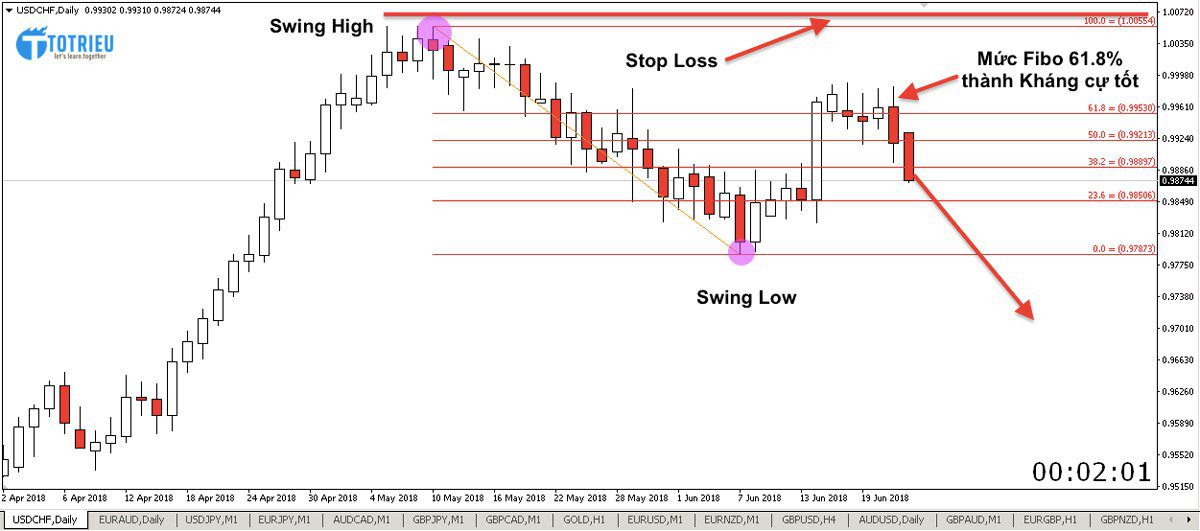 Trong trường hợp, tỷ giá đã chạm vùng 61.8% thì các bạn cũng bắt buộc phải đặt Stop Loss trên các mức Swing High hoặc Swing Low mà không còn cách nào khác..