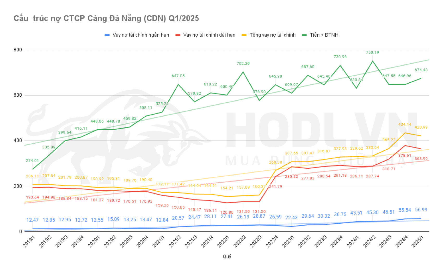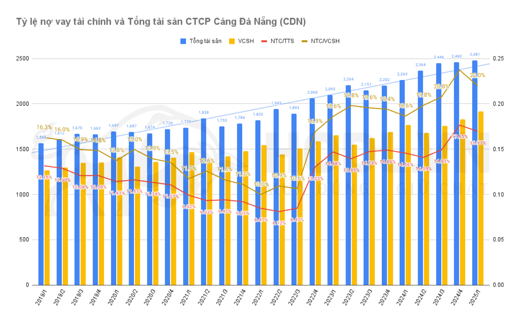 Tổng tài sản và VCSH của CTCP Cảng Đà Nẵng có xu hướng tăng dần. Tỷ lệ nợ cũng tăng phản ánh nhu cầu mở rộng quy mô của Doanh nghiệp. Ở thời điểm Q1/2025, Tỷ lệ nợ vay tài chính/TTS đạt 16,97% trong khi so với VCSH thì đạt 22.0%.