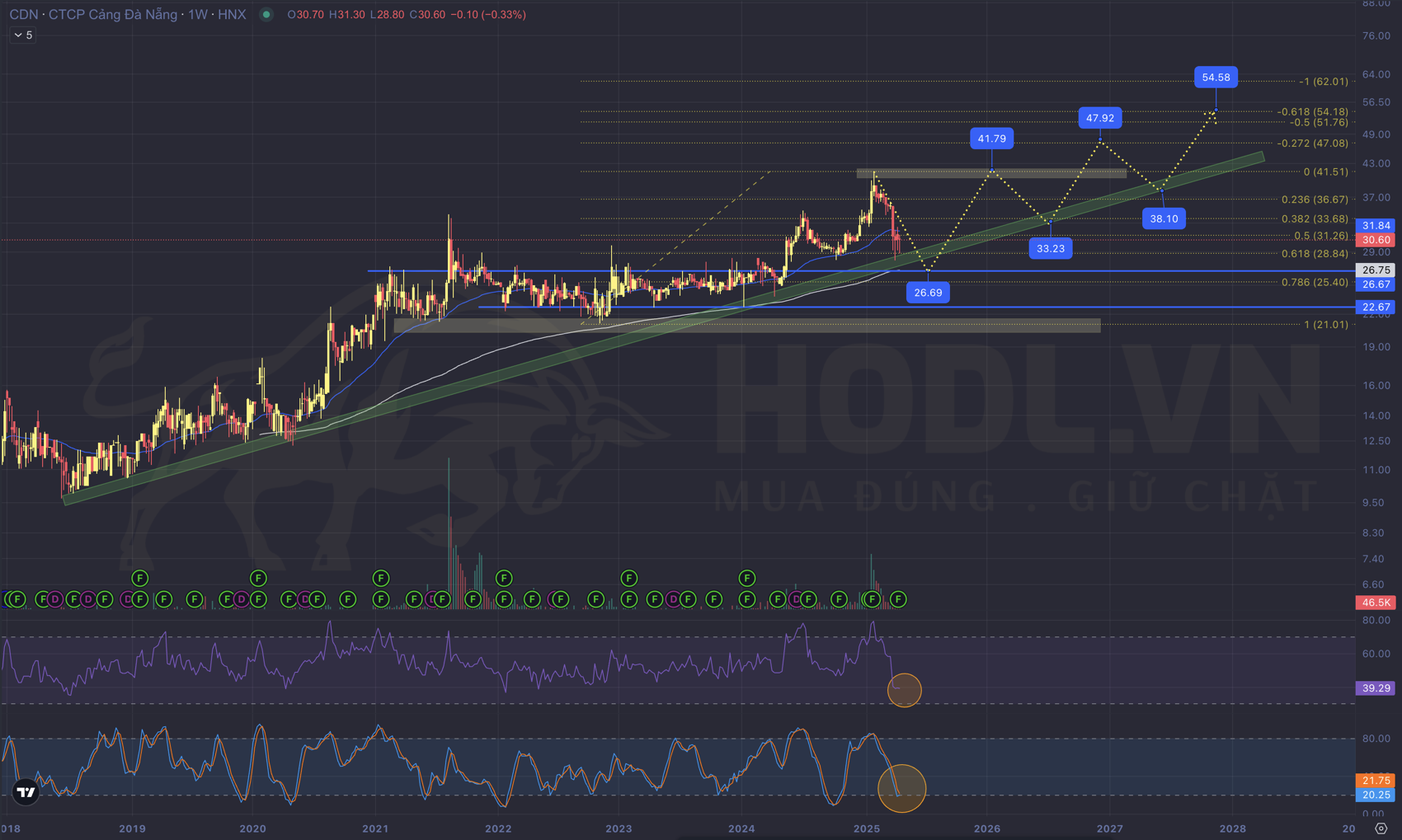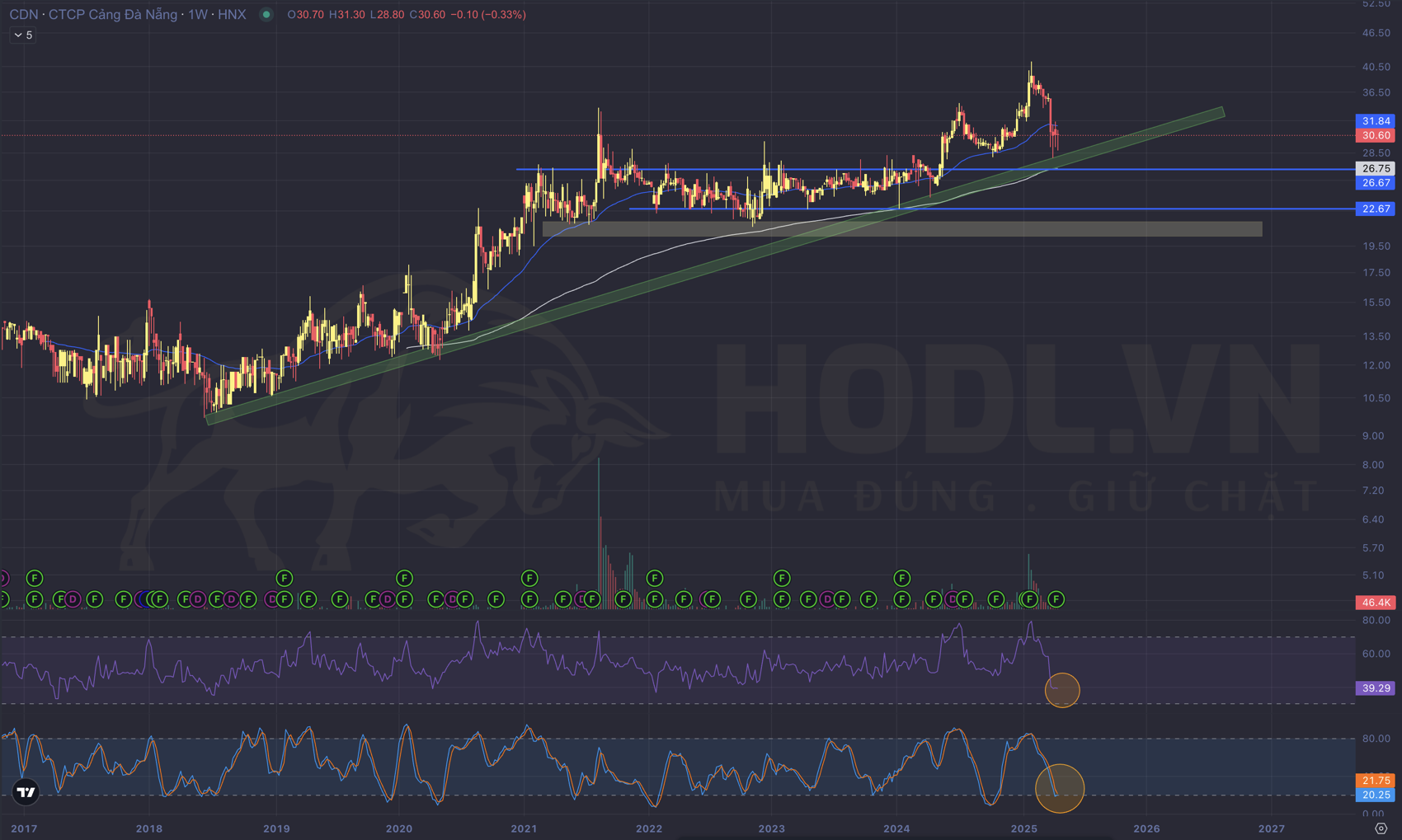 Cổ phiếu CTCP Cảng Đà Nẵng (CDN) năm 2025 đã tạo được một cái ATH và đang trong đợt điều chỉnh kể từ ATH đó. Thật đáng tiếc khi các doanh nghiệp Cảng biển chịu ảnh hưởng nặng từ vụ Thuế đối ứng và dường như chưa thể phục hồi như các ngành khác.