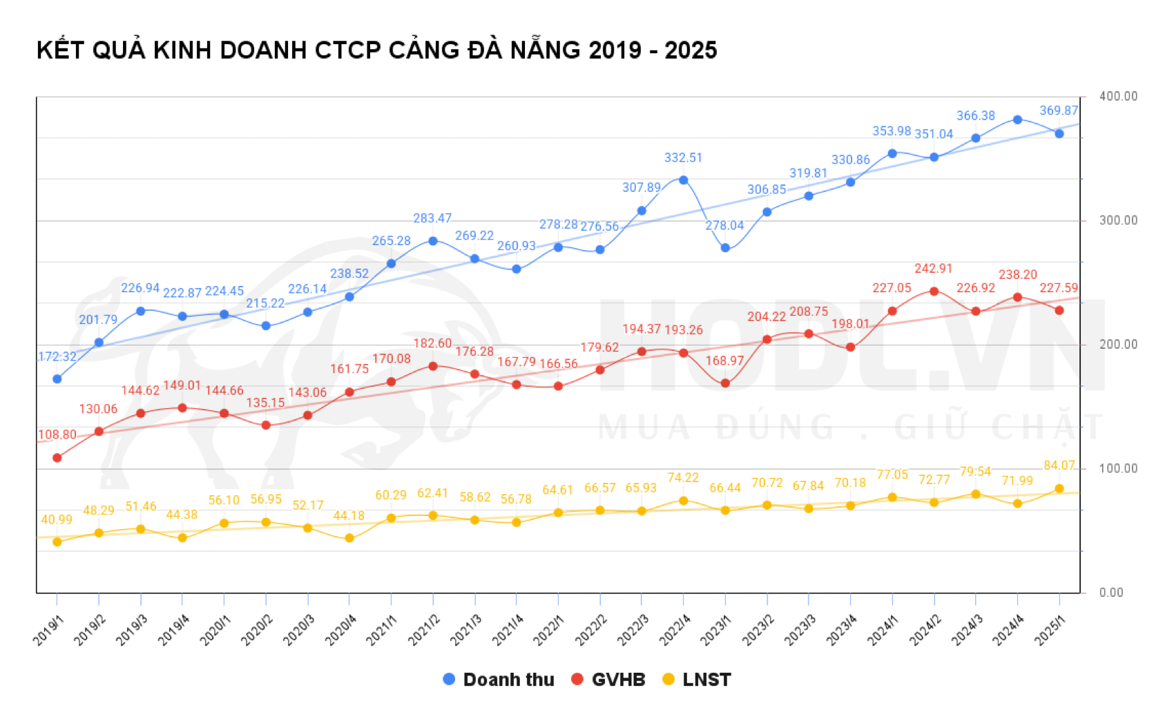 Lợi nhuận sau thuế tăng từ 40.99 tỷ Q1/2029 tới 84.07 tỷ vào Q1/2025. Từ 2019, LNST CTCP Cảng Đà Nẵng (CDN tăng từ mức 184 tỷ lên 301 tỷ vào năm 2024. Đạt mức tăng trưởng trung bình LNST mỗi năm là 10,6%.
