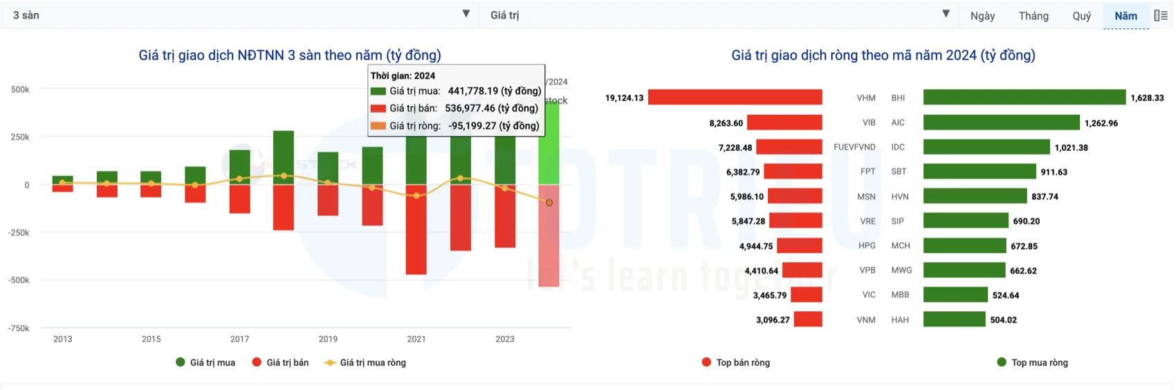Rút vốn khỏi thị trường mới nổi: Các quỹ đầu tư rút tiền từ các thị trường như Việt Nam để quay lại thị trường lớn hơn trong bối cảnh kinh tế toàn cầu có dấu hiệu suy giảm. Trong năm 2024, khối ngoại rút ròng khoảng 95,200 tỷ VNĐ là mức rút kỷ lục so với mức 60,600 tỷ năm 2021. Đây có lẽ là tác nhân chính làm VN-INDEX đi ngang trong cả năm 2024.