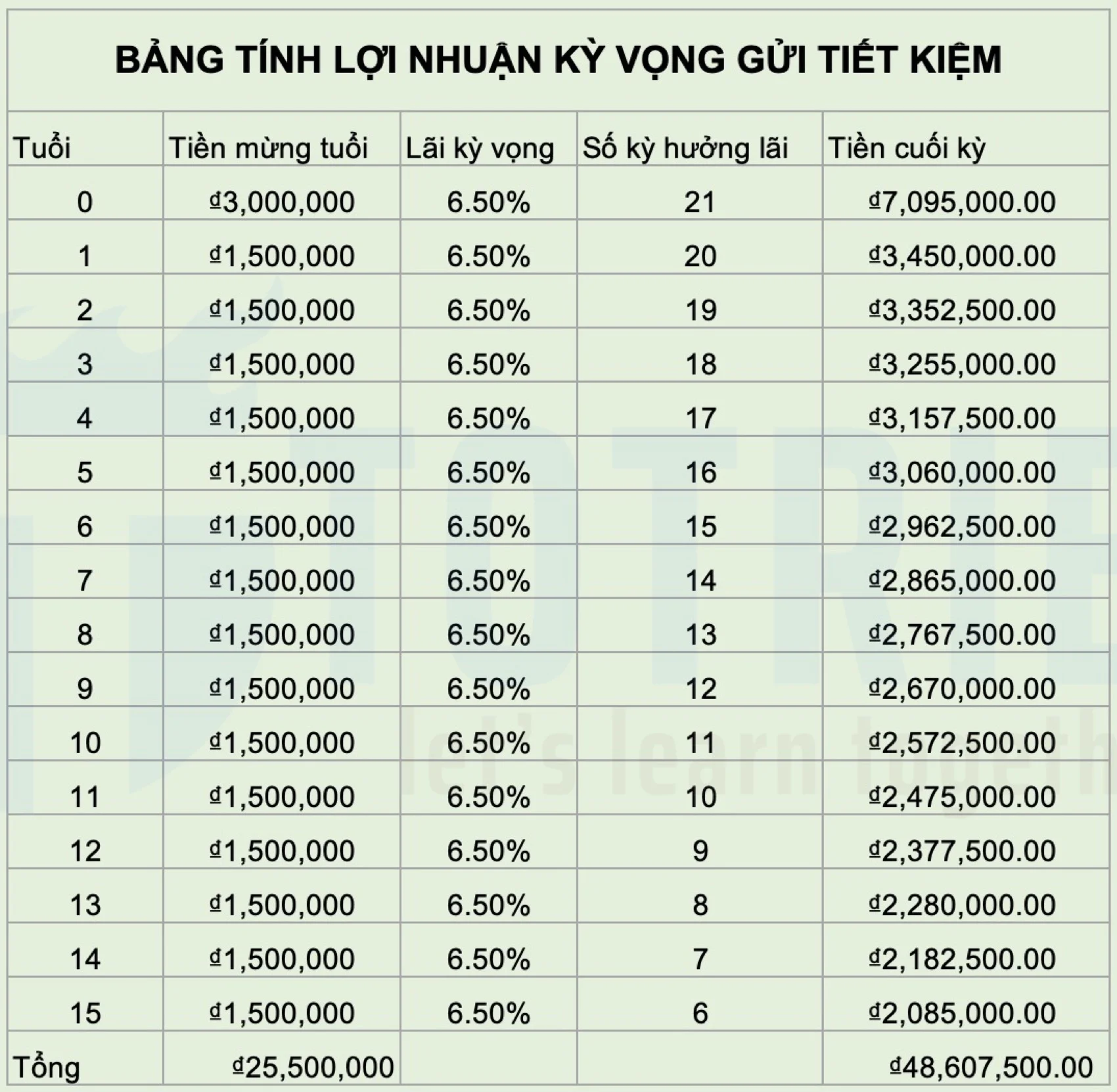 Tôi lấy một ví dụ ước lượng để chúng ta dễ hình dung như sau: Năm đầu đời thường con sẽ nhận được tiền mừng tuổi cao nhất và từ năm sau thì số tiền mừng tuổi sẽ giảm dần. Ví dụ năm đầu con nhận được 10.000.000đ. Từ năm thứ 2 tới năm 16 tuổi thì con nhận mỗi năm là như nhau và đều là 5.000.000đ