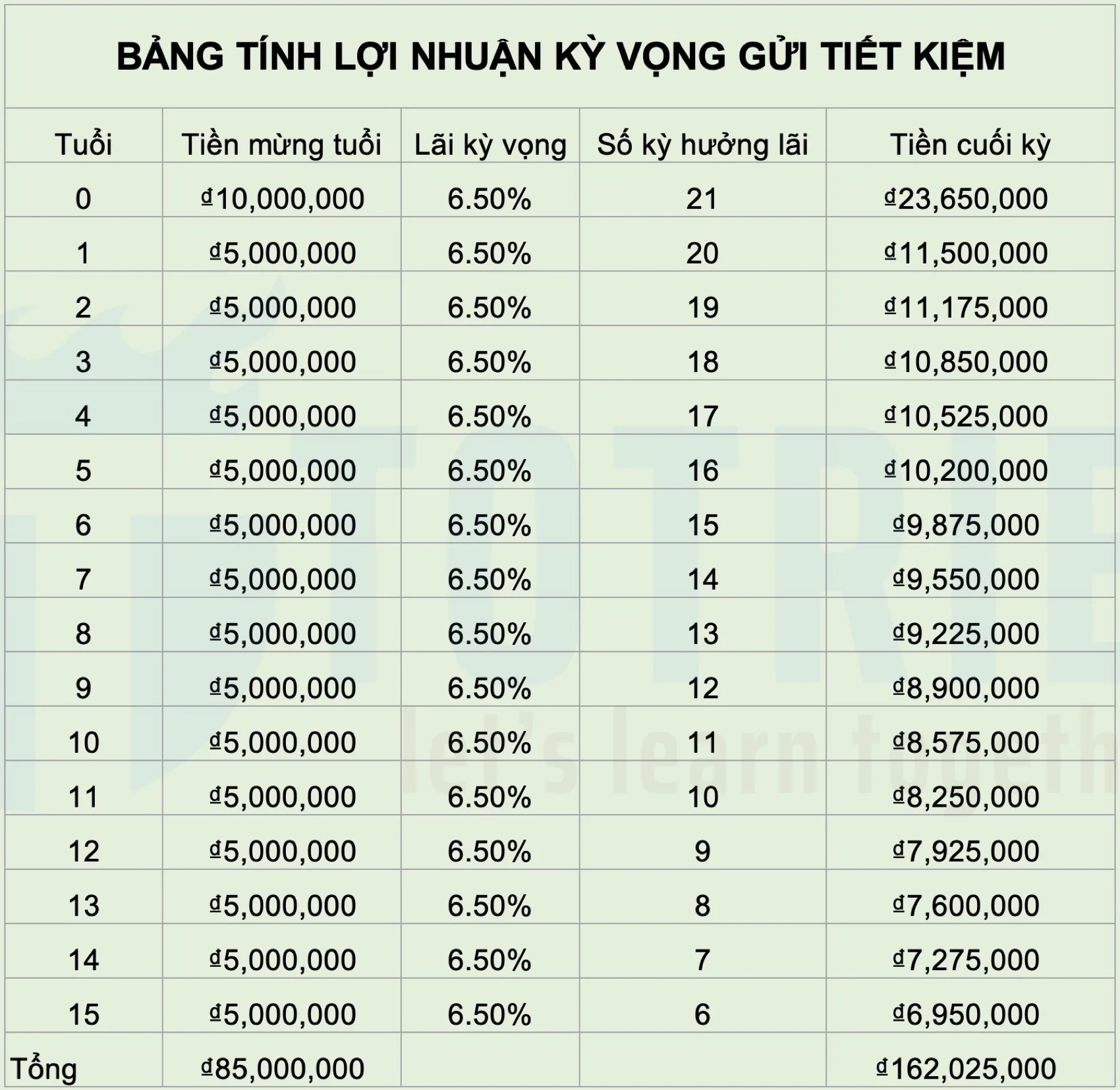 Như vậy sau 16 năm tiết kiệm cho con, chúng ta có thể chuẩn bị cho con 1 số vốn (Chưa tính lời) là 85.000.000đ. Wow! Một khoản tiền không hề nhỏ phải không?