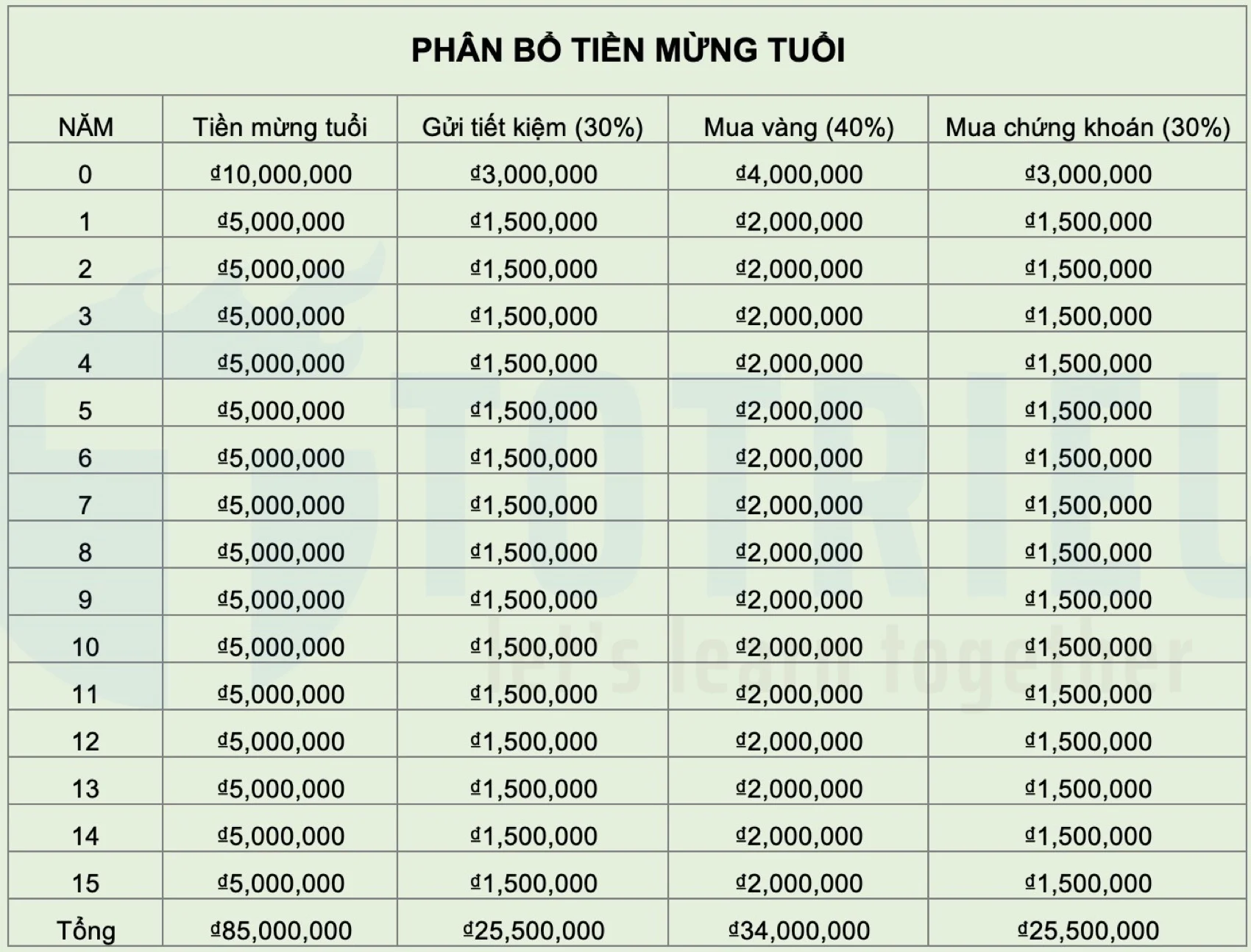 - Tiền mừng tuổi: Là số tiền được phân bổ theo từng năm