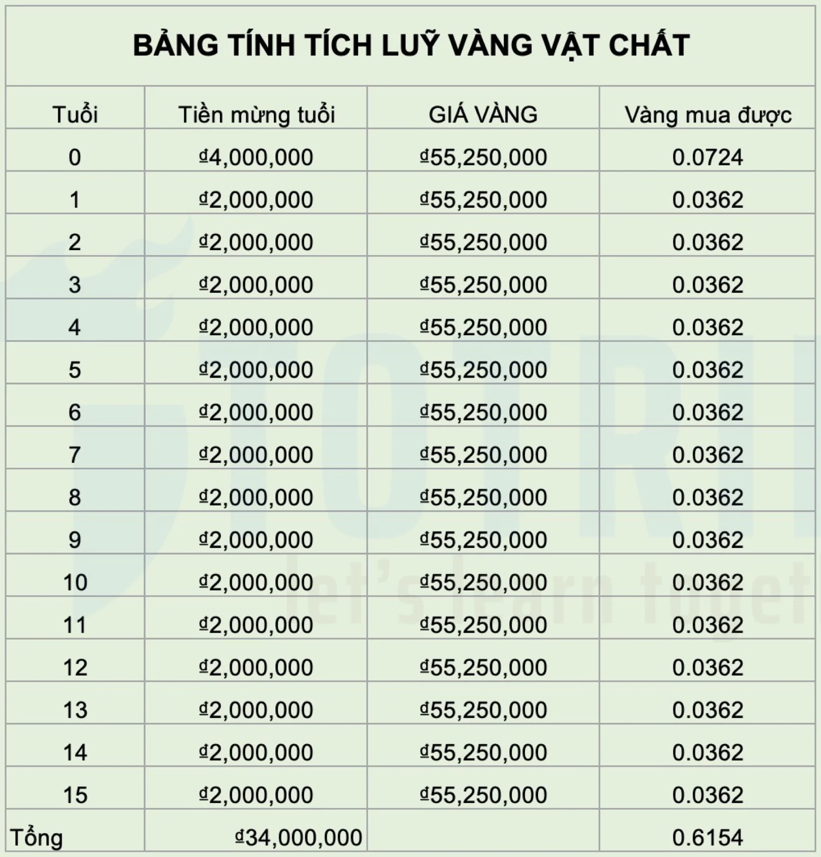 Như vậy sau 16 kỳ tích luỹ bạn có thể có cho con bạn khoảng 6 chỉ Vàng. Cũng đáng kể đấy chứ phải không nào?