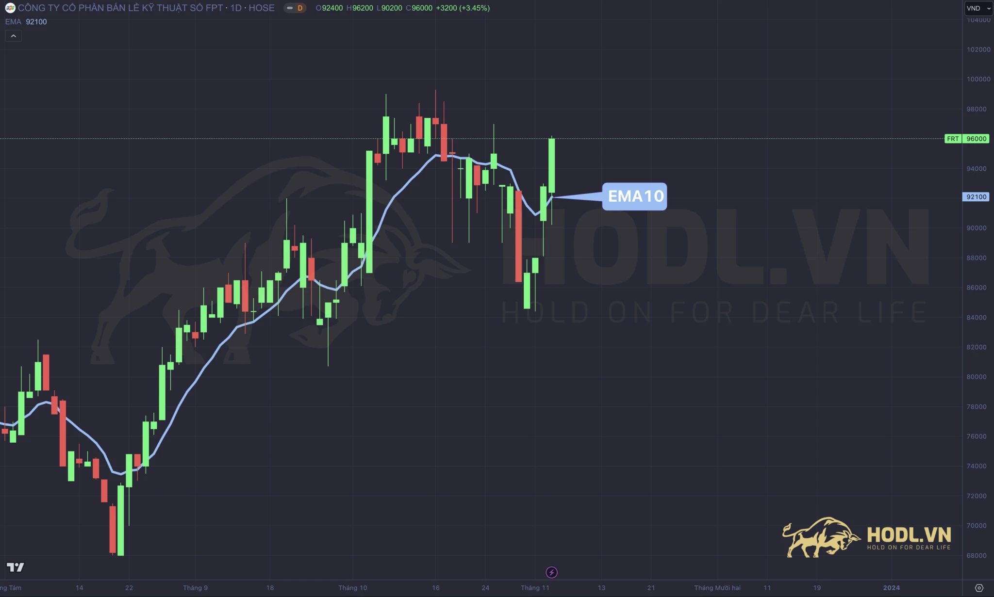 Bây giờ chúng ta sẽ cùng xem lại đôi chút về các đường EMA trong biểu đồ Cổ phiếu FRT