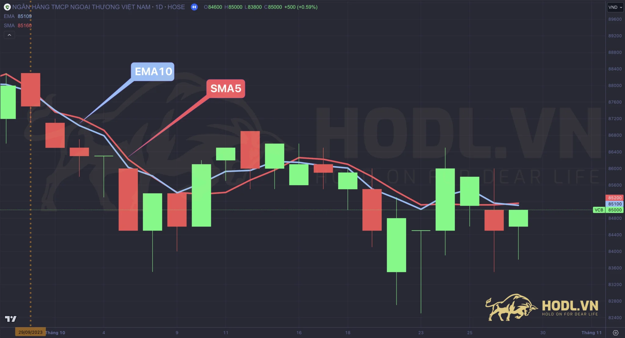 Giá trị EMA đầu tiên (ngày 06/10/2023) được lấy bằng SMA5 của chính ngày 06/10/2023. Giá trị EMA của các ngày tiếp theo được tính theo công thức bình thường.