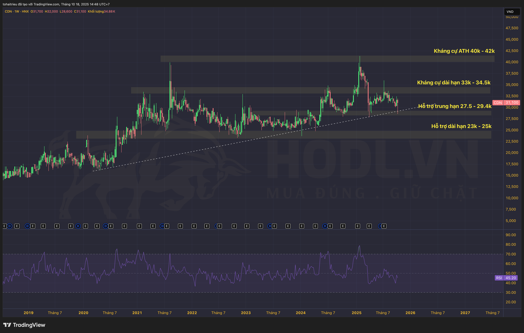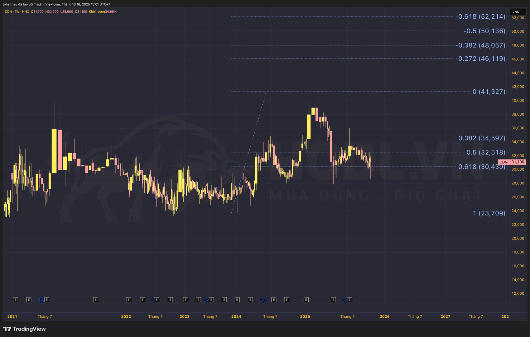 Trong 52 tuần qua, CDN trải qua ba giai đoạn rõ rệt. Giai đoạn 1 (từ tháng 10/2024 đến tháng 4/2025) là đợt tăng trưởng mạnh từ vùng 27,900 VND lên đỉnh 41,400 VND, tăng 48.4%. Giai đoạn này trùng với thông tin công ty công bố dự án mở rộng công suất và kết quả kinh doanh Q4/2024 tích cực.