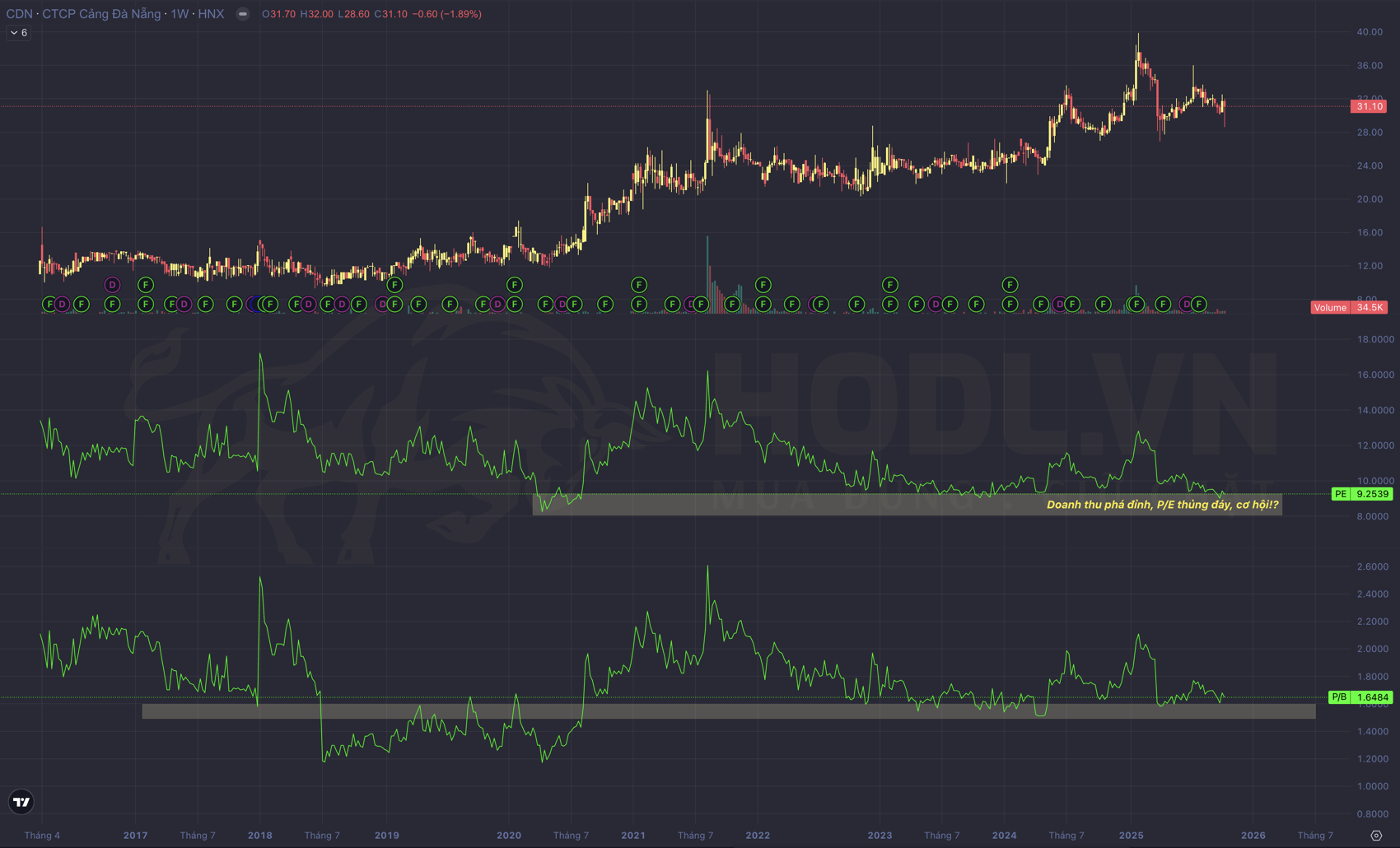 So với ngành và các cảng khác, P/B 1.56x của CDN thấp hơn đáng kể so với trung bình ngành cảng biển Việt Nam khoảng 2.0–2.2x. Điều này cho thấy CDN đang được định giá hấp dẫn hơn, đặc biệt khi xét đến ROE cao (17.1%) và vị thế cảng nước sâu duy nhất tại miền Trung.