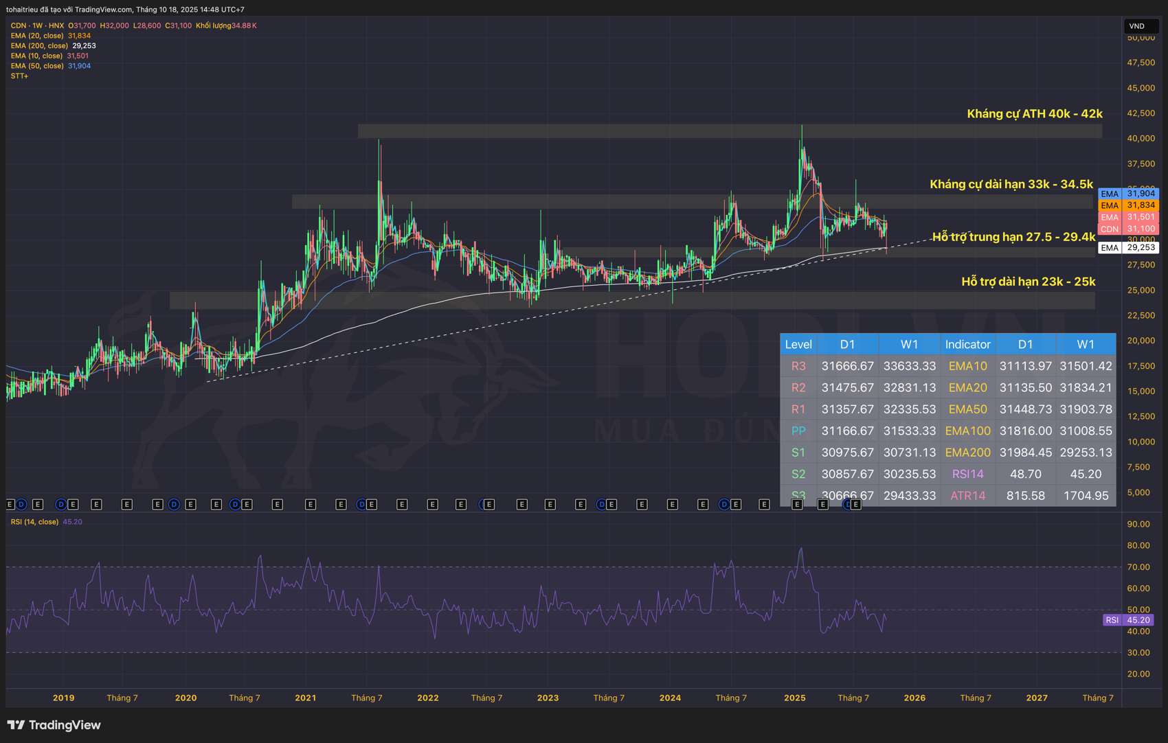 Tuy nhiên, EMA200 vẫn giữ xu hướng tăng rõ ràng và đang ở xa phía dưới (29,500 VND), cho thấy xu hướng dài hạn vẫn tích cực. Chiến lược hợp lý là chờ giá test vùng EMA100-EMA200 để tích lũy.