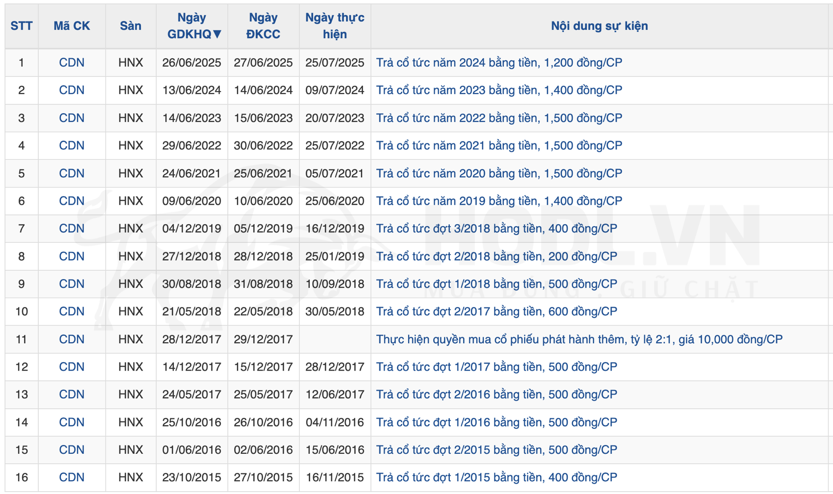 CDN duy trì chính sách cổ tức ổn định với tỷ lệ chi trả (Payout Ratio) khoảng 40% EPS. Năm 2024, công ty chi trả cổ tức 1,200 VND/CP (tỷ lệ 3.9% trên giá hiện tại), bao gồm cổ tức tiền mặt 1,200 VND và không có cổ tức bằng cổ phiếu.